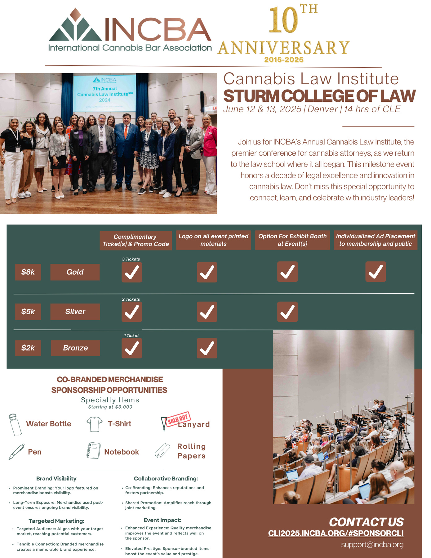 The International Cannabis Bar Association (INCBA) is thrilled to announce the Cannabis Law Institute 2025 (CLI 2025), the marquee conference dedicated to advancing legal excellence in the rapidly evolving cannabis industry. This dynamic event is widely considered to be the preeminent annual conference for cannabis law practitioners, will take place June 12th & 13th, 2025, at Sturm College of Law University of Denver in Denver, Colorado.CLI 2025 will feature the insights of a diverse array of legal experts, policymakers, and industry pioneers from around the world. As the cannabis landscape continues to transform, this conference will provide attendees with invaluable insights and practical knowledge to navigate the complex legal framework in which the cannabis and hemp industry operates.CLI 2025 will feature two days of programming packed with keynote addresses, panel discussions, and breakout sessions, covering a wide range of critical topics (agenda TBA). Attendees will have the opportunity to engage with esteemed experts and gain profound insights into emerging legal trends, regulatory challenges, business opportunities, and social equity issues. CLI 2025 also offers unparalleled networking opportunities, fostering connections among legal professionals, entrepreneurs, policymakers, and industry influencers.